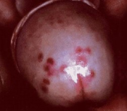 1、包皮龟头炎:包皮和龟头上都可见红斑红点,红斑红点的边缘较清楚,急性发作时有糜烂、渗液。
