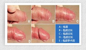 正常男性在青春期发育后,龟头全部或大部分露出,如果不能露出龟头,包皮仍然包裹住全部或大部分龟头,但用手能上翻包皮或勃起后包皮上翻能露出龟头,称之为包皮过长。如图所示: